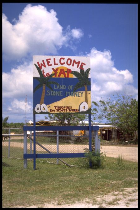 ヤップ島にはパラオから飛行機でゆくのがふつうだが、むかしはこのふたつの島のあいだはしばしばカヌーで往復していたという。ヤップはカロリン諸島の西端にあり、主要な島は四つ。世界的に有名なのは「石貨」だ。これはたしかに「流通」するが、「流通」ということはかならずしもこの貨幣の物理的「移動」をともなうものではなかった。現在ではミクロネシアぜんたいがそうであるように、ここではアメリカドルが流通しているけれども、かっては特定の所在地にある石貨は、その「所有者」を移転することで流通した。一種の「不動産」だとおもえばわかりやすい。